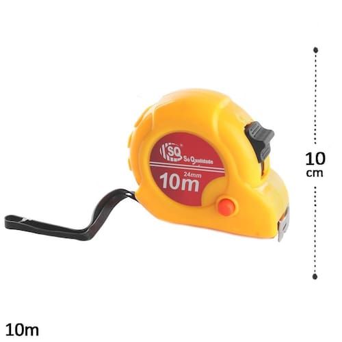 Trena de Plástico 10m X 24mm com Trava Amare - A Trena 10 metros é indispensável de qualquer caixa de ferramenta; - As trenas manuais são ferramentas muito versáteis e úteis no dia a dia; - Afinal, além de serem úteis em grandes obras, é sempre bom medir os espaços onde novos móveis e eletrodomésticos serão colocados, para não ter problemas posteriormente;\nEspecificações: Marca : SQ IMPORT Tipo de material : Metal Cores ou Estampa : Amarelo Dimensões do Produto : 8 X 10m X 3 CM Dimensões da Embalagem : 8 X 10 X 3 CM Peso Bruto (Gramas) : 0.292