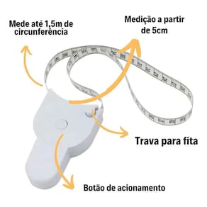 Retrátil só apertar o botão e com stop na medição trava na medição feita Cor: branco Tamanho da fita: 150cm 1,5 metros Tamanho: 9cm x 6cm x 2 cm Material: ABS + PVC + Microfibra