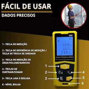 Trena Laser 40m - Compacta e Eficiente Trena Digital a Laser BOM-6544 - Precisão, Praticidade e Tecnologia para Suas Medições A Trena Digital a Laser BOM-6544 é a solução ideal para medições de distância em ambientes internos e externos, oferecendo alta precisão e praticidade. Com múltiplos modos de medição, como Distância, Área, Volume e Pitágoras, ela é perfeita para profissionais e para o uso diário. Destaques: - Medição Precisa: Distância de até 40 metros com precisão. - Modos Diversificados: Medições de Distância, Área, Volume e Pitágoras para atender a diferentes necessidades. - Memória Automática: Retenção de dados automática, lembrando a última unidade de medida utilizada mesmo após o desligamento. - Tela com Backlight: Visor iluminado para fácil visualização em qualquer condição de iluminação. - Nível de Bolha: Inclui nível de bolha integrado para maior precisão no posicionamento. - Design Compacto e Leve: Fácil de transportar e manusear, ideal para o dia a dia. - Economia de Energia: Função de desligamento automático após 150 segundos para preservação da bateria. Especificações Técnicas: - Distância Máxima de Medição: 40 metros - Modos de Medição: Distância, Área, Volume, Pitágoras - Pontos de Referência: 2 Frente e Traseira - Laser: Vermelho Tipo 635nM, 1mW, Classe II - Armazenamento de Dados: Até 20 grupos de medições - Unidades de Medida: metros m , pés ft , polegadas in - Temperatura de Armazenamento: De -20C a 60C - Temperatura de Operação: De 0C a 40C - Fonte de Alimentação: 2 pilhas AAA 1.5V inclusas - Funções Especiais: Medição contínua, soma e subtração, cálculo de valores mínimo/máximo Itens Inclusos: - 1 Trena Digital a Laser BOM-6544 - 3 Pilhas AAA - 1 Cordão para transporte - 1 Manual de Instruções Marca: Não Informado Ean: 7895688649695