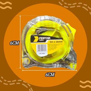 Especificações TÉCNICAS: Comprimento da fita: 3 metros Largura da fita: 16mm Material: Corpo em plástico resistente transparente e fita em aço Sistema de travamento para medições mais precisas Presilha metálica para cinto e alça de segurança inclusa Cor: Transparente com detalhes em amarelo
