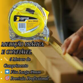 Especificações TÉCNICAS: Comprimento da fita: 5 metros Largura da fita: 19mm Material: Corpo em plástico resistente transparente e fita em aço Sistema de travamento para medições mais precisas Presilha metálica para cinto e alça de segurança inclusa Cor: Transparente com detalhes em amarelo