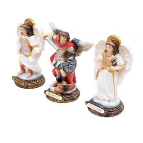 Três Arcanjos 10.5Cm - Enfeite Resina Enfeite decorativo na imagem dos 3 arcanjos São Gabriel, São Rafael e São Miguel de 10. 5 cm de altura cada. Material: resina marca: Minas de Presentes fabricante: Minas de Presentes