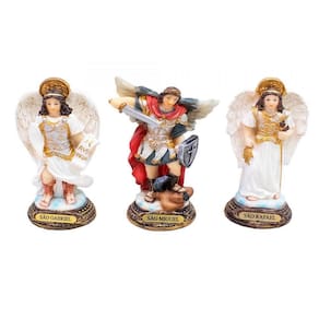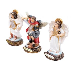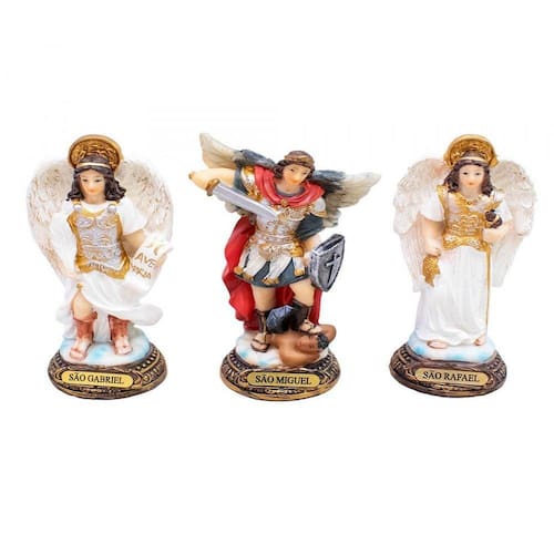 Três Arcanjos 10.5Cm - Enfeite Resina Enfeite decorativo na imagem dos 3 arcanjos São Gabriel, São Rafael e São Miguel de 10. 5 cm de altura cada. Material: resina marca: Minas de Presentes fabricante: Minas de Presentes