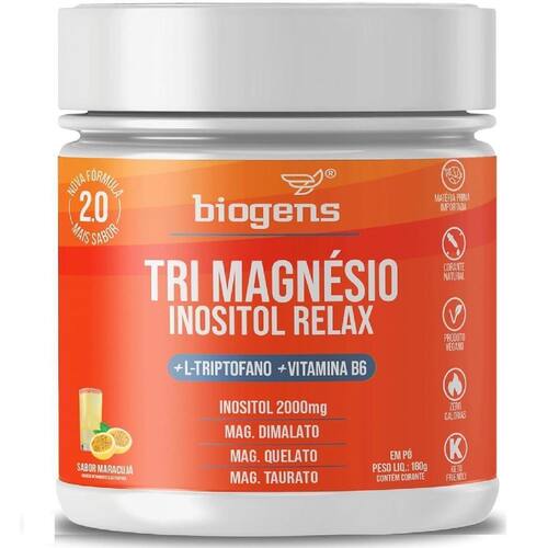 Trimagnésio inositol relax biogens é um suplemento formulado para uma excelente absorção no organismo. Tem em sua composição l-triptofano, inositol e vitamina b6 além das 3 formas especiais de magnésio, sendo estes, magnésio dimalato que vem da associação a duas moléculas de ácido málico, magnésio quelato ou bisglicinato vem da associação a duas moléculas de aminoácidos glicina e o magnésio taurato que vem da associação ao aminoácido de taurina. Essas associações tornam o mineral biodisponível e atuam diretamente no aumento da velocidade de absorção.