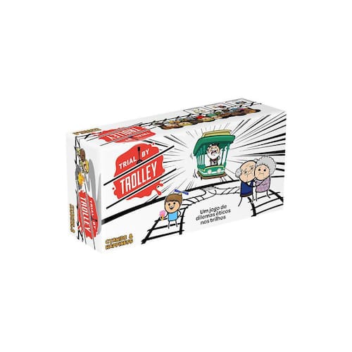 Trial by Trolley Trial by Trolley é um jogo com humor ácido que vem diretamente das tirinhas mundialmente famosas de Cyanide & Happiness. Na partida, um jogador assume o papel do condutor de um bondinho desenfreado à frente de uma bifurcação. Não há tempo para frear: apenas para escolher um dos dois caminhos, atropelando todos que estiverem nele Os outros jogadores se dividem para tentar convencer o condutor a salvar as pobres almas que estiverem do seu lado do trilho. E, claro, aniquilando todos do lado opostoIdade:+14 Número de jogadores: 3 a 13 Duração:15 minutos Mecânicas:ação Simultânea, Gestão de Mão, Jogo em Equipe, Votação Componentes: 497 cartas 88 m m X 63 mm/Standard 1 folheto de regras Fichas de morte Ficha do Bento Bondinho