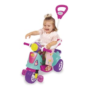 Um clássico da diversão, é o Triciclo Avespa Pink! Ele é dois em um, na fase passeio ele possui anel de proteção com barra adicional de segurança e haste com suporte para bolsa e serve para o responsável guiar. Já na fase pedal, o pequeno já tem autonomia para se divertir com a buzina e se deslocar por conta própria com segurança.