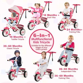 - [Versatilidade máxima]: Experimente a conveniência deste triciclo infantil multifuncional. Ele se transforma perfeitamente em um triciclo infantil para maiores de 10 meses, um triciclo para maiores de 18 meses, um triciclo de treinamento para maiores de 24 meses, um triciclo independente ou um triciclo clássico de 36 a 60 meses, adaptando-se às novas necessidades de seu filho à medida que ele cresce.