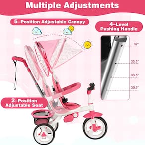 - [Vários ajustes]: Este triciclo para bebês é equo com uma cobertura removível ajustável de 5 posições para proteger seu filho do sol forte. Além disso, a alça de pressão de 4 níveis oferece flexibilidade incomparável para os pais, enquanto o assento ajustável de 2 posições com uma almofada removível garante que seu bebê ande confortavelmente sempre.