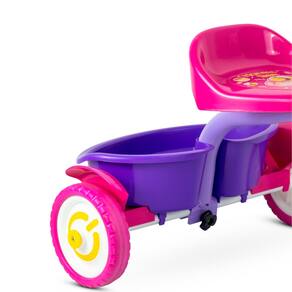 Este triciclo tem quadro, garfo e guidão em alumínio, por isso é super leve (pesa só 2kg) e garante mais durabilidade (não enferruja).