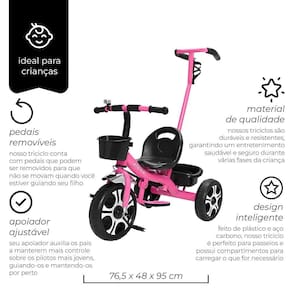 ESPECIFICAÇÕES: Nosso triciclo infantil é confeccionado com materiais de alta qualidade, como plástico e aço carbono, o que confere durabilidade e resistência ao produto. Além disso, o triciclo possui compartimentos espaçosos para transporte de brinquedos, bolsas e outros itens necessários durante o passeio com a criança.O apoio removível é um diferencial importante, pois garante maior conforto e segurança para a criança durante o uso do triciclo, podendo ser facilmente retirado quando não for mais necessário. O apoio também é ajustável, permitindo que os pais tenham mais controle sobre o passeio e possam guiar a criança de forma mais segura. As dimensões do nosso triciclo são ideais para crianças em diferentes fases e idades, com medidas que incluem banco até o chão de 32cm, banco ate pedal baixo de 34cm, banco até pedal alto de 24cm, banco até guidão de 34cm, guidão até pedal alto de 41cm e guidão até pedal baixo de 49cm e a altura máxima do apoiador é de 80cm a 85cm Aproveite um entretenimento saudável e seguro com seu filho por muito tempo com nosso triciclo infantil ajustável e de alta qualidade.