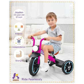 PREVENÇÃO MELHORADA DE ROLO Este triciclo interativo para crianças de 2 a 5 anos apresenta um design triangular mais inteligente com rodas traseiras estendidas e distância entre eixos mais ampla para ajudar a evitar tombamento ou capotamento quando as crianças estão aprendendo a andar.