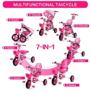 Triciclo Infantil Dobrável 7 em 1 com Alça Ajustável, Arnês de Segurança, Freios de Roda, Capota Removível e Armazenamento, JMMD, Rosa