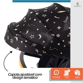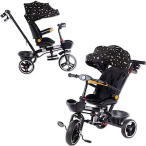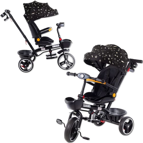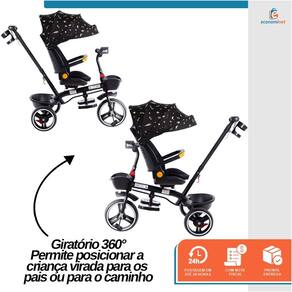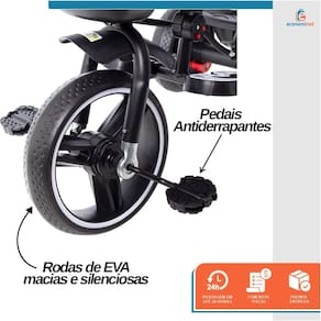 Diferenciais para a Criança: Assento Giratório 360°: A criança pode passear virada para os pais ou para a frente. Luzes e Sons: Painel interativo com músicas para tornar o passeio mais divertido. Conforto: Assento confortável, rodas de EVA macias, capota ajustável e apoio para os pés removível. Pedais e Guidão: Com manoplas e pedais antiderrapantes. Praticidade para os Pais: Haste de Controle: Haste para empurrar e direcionar o triciclo, com porta-copos acoplado. Estrutura 2 em 1: Adapta-se às fases da criança, removendo o apoio de pés e a haste. Porta-Objetos: Inclui cesto frontal e traseiro para levar brinquedos e acessórios. Item de Apoio: Conta com cinto para estabilidade e barra frontal removível.
