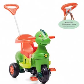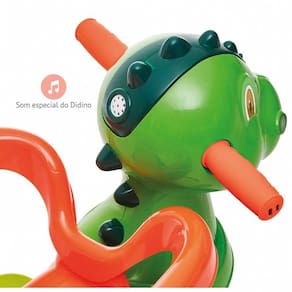 Triciclo Infantil Empurrar Passeio Didino Verde Calesita O queridinho do passeio O carrinho 2 em 1, para passeio e pedal que faz sucesso entre os pequeninos. Com design de dinossauro, ele cativa pelos detalhes que encantam, como a crista e o som que imita um dinossauro Na fase inicial do passeio, o apoio de pés mantém as perninhas do bebê confortavelmente apoiadas, e, a estabilidade do corpo é garantida pelo cercado de proteção, também removível. Já na fase mais independente da criança, retira-se o apoio de pés e o cercado de proteção para a diversão do passeio/ pedal. Pensando na independência para a diversão do pedal, o Didino possui rodas com borracha para evitar derrapar. Contém: 1 Didino 1 Haste/ Empurrador 1 Suporte para bolsa 1 Aro Protetor 1 Par de Apoio de Pés 1 Manual de Instruções INMETRO:IQB - CE-BRI/IQB-005128 - NM 300/2002 - OCP 006