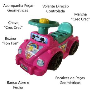 Kendy Carrinho Andador Interativo KETOKINHA Lika BQ0522M O Carrinho Andador Interativo Ketokinha Lika é uma excelente opção de brinquedo para entreter e auxiliar no desenvolvimento da criança. Além de promover a coordenação motora, ele incentiva os primeiros passos e estimula a percepção visual de maneira divertida. Este carrinho vem acompanhado de seis pecinhas geométricas coloridas que se encaixam no banco, proporcionando à criança o reconhecimento de formas durante a brincadeira. O banco também funciona como porta-objetos, podendo ser aberto e fechado, além de servir para armazenar outros brinquedos. Extremamente prático e funcional, o Carrinho Andador Ketokinha é ideal para acompanhar a criança em agradáveis passeios, seja em parques, praças ou durante as brincadeiras no quintal de casa. Equipado com buzina, chave giratória e troca de marcha, proporciona uma experiência interativa e divertida. Para movimentar o brinquedo, basta a criança se sentar e empurrá-lo com as perninhas, promovendo o fortalecimento muscular. Desenvolvimento: - Aprendizado pela imitação - Atenção e concentração - Compreensão causa e efeito - Coordenação Motora - Habilidades Sociais - Imaginação e criatividade Especificações: - Cor: Rosa/Verde - Composição: Prolipropileno - Marca: Kendy Brinquedos - Registro INMETRO: 010803/2022 - Peso Máximo Suportado: 16Kg - Indicado para crianças maiores de 12 meses Características: - 1 Buzina - 1 Chave giratória - 1 Marcha - Porta-objetos - Porta-malas com abertura e fechamento Medidas Aproximadas: - Comprimento: 55cm - Largura: 25cm - Altura: 28cm Contém: - 1 Carrinho Andador Ketokinha Lika - 6 peças geométricas