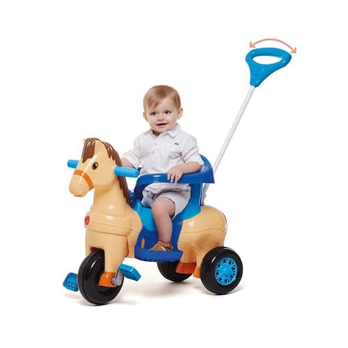 Triciclo Infantil Passeio e Pedal Cavalinho Potó - Calesita deixa os passeios com o bebê mágicos. Ele é muito divertido e imita som de cavalo! O Cavalinho Calesita Potó é um brinquedo 2 em 1 que acompanha as fases de crescimento da criança com todo o conforto e segurança necessário para a diversão ser completa. Na primeira fase, o apoio de pés mantém as perninhas do bebê apoiadas e, a estabilidade do corpo é garantida pelo cercado de proteção, também removível. Já na fase mais independente do bebê, retira-se o apoio de pés e cercado de proteção para a diversão do passeio pedal. Pensando nessa independência para a diversão do pedal, o Potó foi projetado com roda dianteira acompanhada de borracha para evitar derrapar. POTÓ CALESITA - 2 EM 1 - PASSEIO E PEDAL: FUNÇÃO PASSEIO: Na primeira fase, o adulto utiliza a direção guiada para manobrar com segurança e facilidade. O apoio de pés mantém as perninhas do bebê apoiadas e, a estabilidade do corpo é garantida pelo cercado de proteção. FUNÇÃO PEDAL: Retira-se o apoio de pés e cercado de proteção para transformar o Potó em um triciclo convencional para a criança brincar de pedalar. DETALHES - Suporte para bolsa - Direção e rodas guiadas pelo empurrador - Rodas dianteiras com borracha para não derrapar - Encaixe e desencaixe do empurrador fácil e pratico HABILIDADES DESENVOLVIDAS: - Coordenação entre olhos e pés - Coordenação motora fina - mãos e dedos - Coordenação motora grossa - braços e pernas INFORMAÇÕES: • Produto: Triciclo Potó • Peso máximo suportado: até 30 kg • Marca: Calesita Brinquedos • Recomendação: - Passeio: A partir de 12 meses de idade - Pedal: A partir de 24 meses de idade • Conteúdo: 1 Potó, 1 Haste/Empurrador, 1 Suporte para bolsa, 1 Aro Protetor, 1 Par de Apoio de Pés e 1 Manual de Instruções AVISO: • As imagens são meramente ilustrativas. As cores e estampas dos produtos podem ter variações. As informações são de responsabilidade do fabricante ou fornecedor.