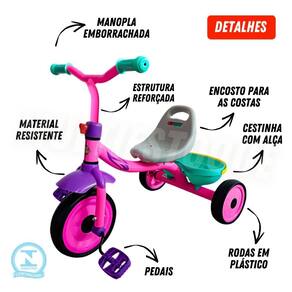 Triciclo infantil - rosa Triciclo infantil rosa Você já percebeu como é essencial para as crianças explorarem o mundo ao seu redor Sem um brinquedo adequado, elas podem perder a oportunidade de desenvolver habilidades importantes, como equilíbrio e coordenação, enquanto se divertem. O triciclo infantil rosa é a solução perfeita para pequenos exploradores com um design encantador e cores vibrantes, ele não só atrai a atenção, mas também oferece segurança e conforto. Cada pedalada ajuda no desenvolvimento da coordenação motora e da independência, permitindo que as crianças se sintam confiantes enquanto brincam, tanto dentro de casa quanto ao ar livre. Benefícios - estimula o desenvolvimento motor e a autonomia - design seguro e confortável para longas brincadeiras - acompanha o crescimento da criança com assento ajustável - ideal para uso em ambientes internos e externos Especificações técnicas - altura da bicicleta: aproximadamente 55cm - comprimento da bicicleta: aproximadamente 62cm - comprimento do guidão: aproximadamente 41cm - peso aproximado: 2,500kg - registro inmetro: 002966/2021 Conteúdo da embalagem - 01 triciclo infantil - rosa Não perca a chance de proporcionar momentos incríveis de aventura e aprendizado para seu filho adquira já o triciclo rosa e veja a alegria em cada pedalada Informações importantes sobre a compra - com de fábrica Dúvidas frequentes: 2 - em quanto tempo meu pedido será enviado 3 - é confiável fazer esta compra Resposta: desde a criação da nossa empresa já temos milhares de clientes satisfeitos em outras lojas online. Somos uma loja oficial neste marketplace. Além de você ter todas as garantias desta plataforma, ainda lhe oferecemos de fábrica. 4 - os produtos possuem Resposta: sim, oferecemos de 30 dias em todos nossos produtos. Caso ocorra qualquer problema iremos tratar da melhor forma para resolver o ocorrido. 5 - essa compra é segura Resposta: sim, oferecemos total segurança na sua compra bem como sigilo dos seus dados. 6 - e se eu não gostar do produto, terei meu dinheiro de volta Resposta: de acordo com o cdc código de defesa do consumidor todo cliente de compras online tem até 7 dias para devolver o produto em caso de arrependimento. E você não terá custo na devolução. Lembrando que você será reembolsado em 100% do valor da compra. Caso você tenha alguma dúvida, nos envie uma mensagem e responderemos o mais rápido possível. Marca: Não Informado