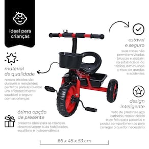 DESIGN: Feito de plástico e aço carbono, nosso triciclo é perfeito para dar passeios com seu filho. Possui compartimentos para carregar as coisas que necessita sem tirar o conforto de seu filho durante o passeio. É fácil de montar e acompanha uma chave para auxiliar na montagem. Medidas: C- 66cm L- 45cm A- 53cm e Pesa: 2,5kg