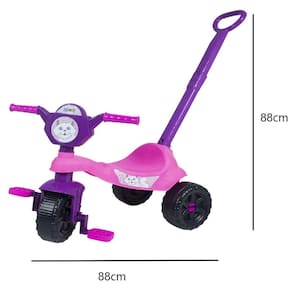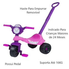 Kendy Carrinho de Passeio / Pedal Infantil KEMOTOCA Gatinha C/ Haste BQ0509M Os Triciclos Kendy são fundamentais para o desenvolvimento infantil, promovendo coordenação motora e fortalecimento das articulações. Com a Kemotoca, a criança explora sua criatividade em diversas brincadeiras, enquanto desenvolve equilíbrio e desfruta de momentos de pura diversão. Equipado com rodas largas para facilitar a pilotagem, possui um empurrador removível e é construído com materiais de alta qualidade, garantindo durabilidade e satisfação do cliente. Desenvolvimento: - Aprendizado pela imitação - Atenção e concentração - Compreensão causa e efeito - Coordenação Motora - Habilidades Sociais - Imaginação e criatividade Especificações: - Cor: Rosa/Lilás - Composição: Prolipropileno - Marca: Kendy Brinquedos - Registro INMETRO: 007638/2022 - Possui haste removível - Peso Máximo Indicado: 16Kg - Indicado para crianças maiores de 24 meses Medidas: - Comprimento: 88cm - Largura: 42,5cm - Altura: 88cm Contém: - 1 Motoca