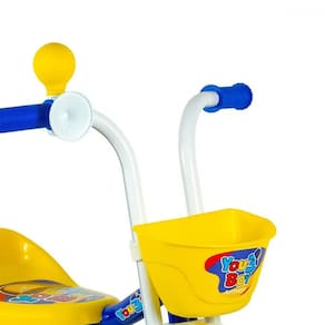 Alem de funcional, o modelo conta com cores vibrantes em amarelo e azul, que encantam e estimulam o uso. O cesto traseiro e perfeito para levar brinquedos ou pequenos objetos, tornando o passeio ainda mais completo.