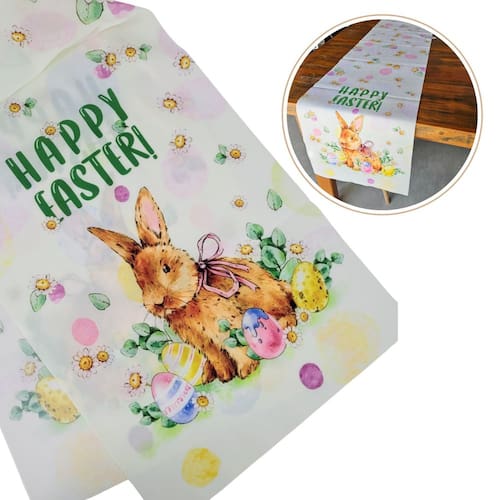 Design Encantador e Alegre: A estampa com flores margaridas e coelho traz um toque lúdico e divertido para a sua decoração de Páscoa, encantando seus convidados e criando um ambiente leve e festivo. Alta Durabilidade: Confeccionado em 100% poliéster, o caminho de mesa oferece resistência e mantém sua beleza por muito mais tempo, mesmo após várias lavagens. Fácil Manutenção: O material de poliéster é fácil de limpar, garantindo praticidade para o dia a dia sem perder o charme e a delicadeza. Toque Suave e Confortável: O tecido tem uma textura macia ao toque, ideal para ocasiões especiais e confraternizações, proporcionando conforto e elegância. Leve e Prático: Pesando apenas 95 gramas, é fácil de manusear, retirar e guardar, oferecendo praticidade para o uso diário.