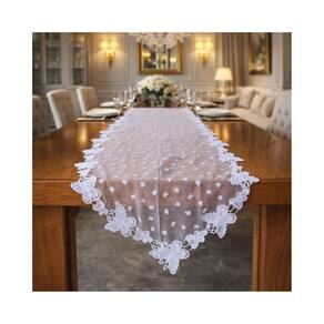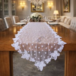 Trilho Caminho de Mesa em Renda Guipir com Tule Poá Borboleta Luxo,é perfeito para quem deseja uma decoração delicada e sofisticada. A combinação da renda guipir com o tule poá traz leveza e charme à peça, criando um visual elegante e ao mesmo tempo moderno. Na cor branca, é ideal para valorizar mesas de jantar, aparadores e buffets, adaptando-se facilmente a diferentes estilos de decoração. Com medidas de 2,00 x 0,40 m, proporciona excelente caimento e destaque ao ambiente, sendo uma ótima escolha para ocasiões especiais, recepções, festas e celebrações. Um trilho decorativo que une requinte, suavidade e luxo, transformando a composição da mesa com muito bom gosto.