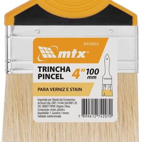 Alcance um acabamento profissional em seus projetos com a Trincha Pincel 4'' da MTX! Projetada para aplicação de vernizes em áreas extensas, como decks, pisos e móveis, esta trincha garante uma cobertura uniforme e livre de falhas. Suas cerdas brancas de alta qualidade retêm a quantidade ideal de verniz, evitando escorrimentos e proporcionando um resultado impecável. O cabo ergonômico de 2 componentes oferece conforto e segurança durante o uso prolongado, reduzindo a fadiga e aumentando a precisão. Ideal para profissionais e entusiastas do 'faça você mesmo', esta trincha MTX é a ferramenta perfeita para transformar seus projetos em obras de arte. Invista em qualidade e obtenha resultados duradouros com a trincha que combina desempenho, conforto e praticidade. A escolha inteligente para um acabamento perfeito em cada detalhe.
