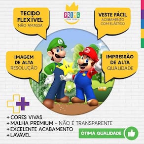 Trio capa cilindro + painel redondo super mario bross tecido 1,50m Medida do painel: 1,50m x 1,50m serve para estruturas de 1,20m a 1,50m Medida do trio de capa para cilindro:Tamanho p: a altura: 48cm // d diâmetro: 39cm // c circunferência: 122cmTamanho m: a altura: 60cm // d diâmetro: 45cm // c circunferência: 141cmTamanho g: a altura: 80cm // d diâmetro: 51cm // c circunferência: 160cm Acabamento com elástico Não acompanha cilindro em mdf e suporte Chegou a novidade que todos esperavam, o kit capa de cilindro de tecido da decor. Com a mesma qualidade de nossos painéis, para unificar aos painéis e dar mais charme a sua festa. Assim como nossos painéis são impressos em tecido dando uma sensação de realidade para o ponto principal da decoração. Mais detalhes: - veste fácil. Ágil para instalar- não reflete luz do flash.- lavável.- pode ser passado a ferro.- fácil transporte e armazenamento. Observações importantes: -as alterações devem ser solicitadas antes da compra, sujeitas a cobranças adicionais Vantagens dos painéis e capas de cilindros:Conheça, a seguir, as principais vantagens de adotar os painéis de tecido sublimado em sua festa -não deformaO tecido não deformam com o tempo, garantindo economia ao longo prazo. O tecido também não apresenta vincos, não amassa e pode ser lavado sem perder a qualidade de sua impressão. -sem brilhoEm ambientes iluminados, o tecido não reflete a luz, o que poderia deixar parte da capa ofuscado pelo brilho da iluminação local. -não retém águaO tecido de poliéster tem um grau de absorção da água muito baixo, em torno de 0,5%. Ele não molha como qualquer outro material, e mesmo aconteça, tem a capacidade de secar muito rapidamente, além de boa resistência à abrasão e aos solventes orgânicos. Marca: Prime Decor Festas