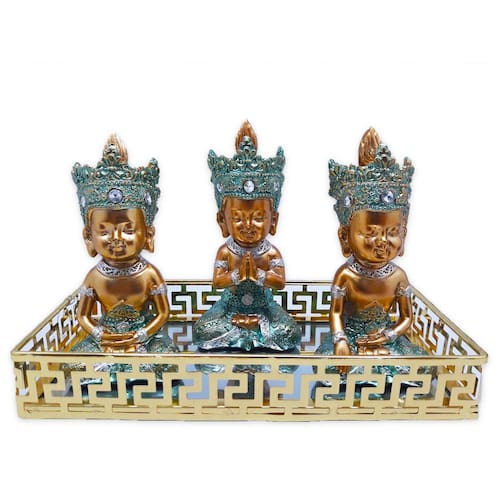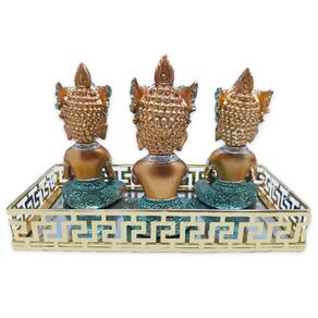 Enfeite composto de 1 Trio de Budas com 12 cm de altura e uma bandeja espelhada.