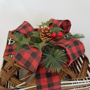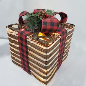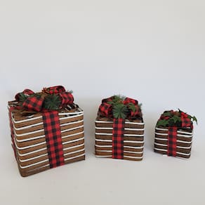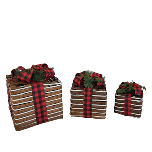 KIT COM 3 CAIXAS DE PRESENTES, ESTRUTURA DE METAL REVESTIDA COM FITA SINTÉTICA MARROM E BRANCA, ILUMINAÇÃO COM LEDS ( 3 PILHAS AA CADA CAIXA) E ARRANJO CONTENDO: 1 LAÇO COM FITA XADREZ, PINHA NATURAL, GALHOS VERDES E MINI FRUTINHAS VERMELHAS.