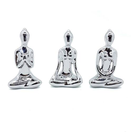 Lindo trio de Yoga com 3 peças em estilo moderno rezando e meditando.