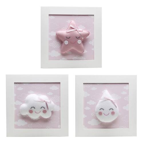Quadrinho em madeira com fino acabamento laqueado e perfeito para colocar na porta da maternidade ou no quarto do bebê. Eternize esse momento especial com esse enfeite decorativo, que proporcionará uma ambientação convidativa e encantadora. Dados Técnicos Três quadrinhos decorados feitos em madeira MDF com pintura laqueada, tecido de fundo e decoração em feltro. Medidas Comprimento: 27 cm Largura: 27 cm Espessura: 2 cm