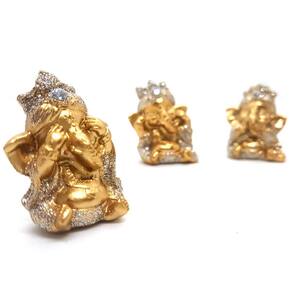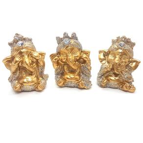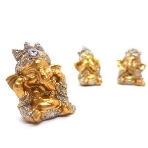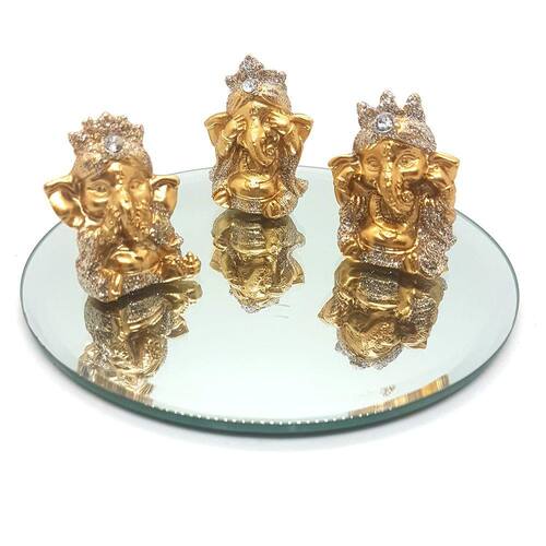 Lindo trio de Ganesha com 3 peças em estilo moderno dourado com brilho com bandeja espelhada redonda de 12 centímetros de diâmetro.