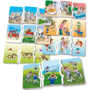 Ao encaixar as peças seguindo a ordem dos acontecimentos, a criança forma uma sequência composta por três partes resultando em uma cena completa.
