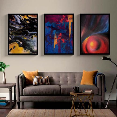 Trio Quadros Decorativos Abstrato Moderno Sala Escritório Quadros Decorativos com Moldura 130x64Cm medida total Quadros em MDF 3mm com moldura em madeira com 2cm de largura e 1cm de espessura. Opção de moldura preto . Especificações: - Medida Total 40x60cm - Profundidade de 1cm - Moldura em Madeira de reflorestamento 100% madeira - Fundo em MDF 3mm com aplicação de adesivo impresso. Não acompanha vidro. Ean: 0603922845775