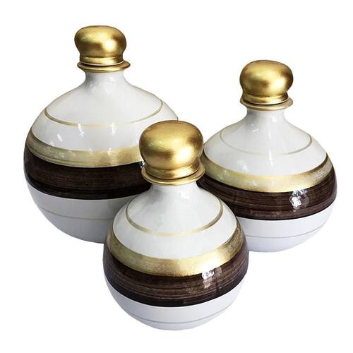 Trio vasos shalom em cerâmica de sala decorativos - gold brown Trio de vasos shalom em cerâmica de aparador e sala decor Trio de vasos shalom em cerâmica ecológica decorativa de alta qualidade e durabilidade com acabamento diferenciado, inspirador e moderno. O produto em cerâmica é uma belíssima peça atemporal, sendo ótimo para entusiastas e profissionais da decoração, pois garante charme, elegância, modernidade e sofisticação. Repagine e decore a sua casa, cozinha, sala de jantar, sala de estar, aparadores e mesas em gerais, deixando-as com um clima agradável, alegre e descontraído, sendo também uma ótima opção de presente. Dimensões: - vaso shalom grande: altura: 21 cm x largura: 9 cm. - vaso shalom médio: altura: 18 cm x largura: 8 cm. - vaso shalom pequeno: altura: 16 cm x largura: 7 cm. Características do produto: - trio de vasos shalom em cerâmica ecológica de alta qualidade e durabilidade com pintura artesanal. - produzido por artesões profissionais seguindo um padrão de qualidade que atenda o gosto dos nossos clientes Cuidados: - recomendamos o uso de pano levemente umedecido para sua limpeza. do produto: - o produto é muito bem acomodado dentro da caixa, e super embalado para evitar quebras, ainda assim possuímos um sistema de e troca. Imagens meramente ilustrativas - produto artesanal, podendo variar de cor e/ou tonalidade Marca: Retrofenna Decor