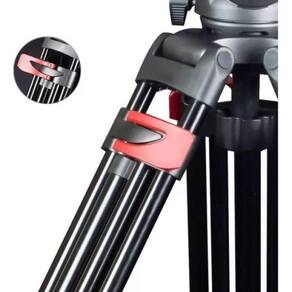 O tripé profissional com cabeça fluida e espalhador de solo MILIBOO MTT609A possui pernas resistentes, compostas por alumínio e reforçadas em três seções, presas por travas flip. A base possui um espaçador de solo e as pontas pés de borracha retráteis.