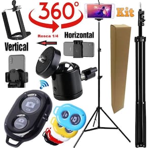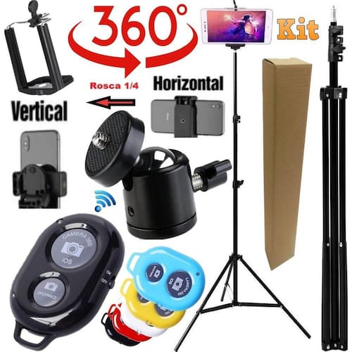 Tripé grande suporte filmagem no celular apoio vertical controle foto vídeo make acessórios ajustável universal completo Tripé 2,10m câmera celular pedestal universal youtuber + suporte celular com este modelo você consegue usar o celular tanto na vertical quanto na horizontal Possui também ball head permite rotação de 360º do ring acompanha controle disparador bluetooth Tripé robusto de alta qualidade, possui molas internas para amortecimento, braçadeiras reforçadas em nylon, altura de 2,10 mts, abertura dos pés de 88 cm promovendo boa estabilidade, pino 5/8 com rosca 1/4 para usar diversos tipos de equipamentos. Pintura preta, tornando - o mais discreto no ambiente de cine & foto. Além disso este tripé é um modelo muito recomendado para utilização junto a equipamentos fotográficos e iluminação, uma vez que possui uma estrutura resistente com armação composta por materiais de alumínio e partes plásticas, conseguindo alcançar uma altura máxima de 2,10 metros e mínima de 68cm quando totalmente fechado, pesando somente cerca de 780 gramas, sendo portanto, carregado com muita facilidade e praticidade. O tripé de iluminação tpi-200 ainda possui 3 seções e 3 travas, que proporcionam ao usuário uma regulagem na altura, de forma que possibilite ao mesmo criar diversos modos de uso, conforme a necessidade de operação em cada um de seus trabalhos. Controle remoto bluetooth celular É um produto que foi desenvolvido para facilitar a vida dos usuários de smartphones que adoram tirar aquela selfie sozinho ou com a galera. Com ele, você pode facilmente tirar fotos ou fazer vídeos sem precisar tocar no seu aparelho Atenção a cor do controle bluetooth é escolhida aleatoriamente, conforme a disponibilidade em estoque O kit contém: 1 tripé de até 2,10m de alcance 1 suporte para celular 1 cabeça de tripé - ball head 1 controle bluetooth