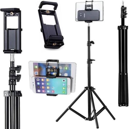 Tripé pedestal 2,10m profissional suporte 2 em 1 encaixe para celular e tablet apoio universal ajustável rosca 1/4 Tripé robusto de alta qualidade, possui molas internas para amortecimento, braçadeiras reforçadas em nylon, altura de 2,10 mts, abertura dos pés de 88 cm promovendo boa estabilidade, pino 5/8 com rosca 1/4 para usar diversos tipos de equipamentos. Pintura preta, tornando - o mais discreto no ambiente de cine & foto. Reforçado, chegando a suportar 6 kg , pode ser com diversos equipamentos de iluminação. acompanha suporte para celular e tablet . Além disso este tripé é um modelo muito recomendado para utilização junto a equipamentos fotográficos e iluminação, uma vez que possui uma estrutura resistente com composta por materiais de alumínio e partes plásticas, conseguindo alcançar uma altura máxima de 2,10 metros e mínima de 68cm quando totalmente fechado, pesando somente cerca de 780 gramas, sendo portanto, carregado com muita facilidade e praticidade. O tripé de iluminação tpi-200 ainda possui 3 seções e 3 travas, que proporcionam ao usuário uma regulagem na altura, de forma que possibilite ao mesmo criar diversos modos de uso, conforme a necessidade de operação em cada um de seus trabalhos. Suporte adaptador 2 em 1 para tablet celular Muito útil para selfies, fotos e gravações de vídeo para instagram, facebook, youtube, tiktok etc. Material de alta qualidade que prende firmemente o seu smartphone, tablet ou . Ideal para uso com mini tripé de mesa, pau de selfie ou qualquer tripé com sistema de rosca 1/4. Abertura compatível com aparelhos celulares de 5,5 até 8,5 cm de largura. Abertura posterior para aparelhos de 11 até 18 cm de largura. O kit contém: 1 tripé profissional de até 2,10m de alcance 1 suporte adaptador 2 em 1 para tablet e celular Atenção: Não acompanha celular ou dispositivos. lacrado em sua embalagem .
