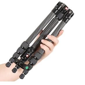 Tripé Portátil Com Cabeça Ball Head Kingjoy K029B+V00 Fibra De Carbono O compacto Tripé Portátil Kingjoy K029B Fibra de Carbono com Cabeça Ball Head V00 e placa de liberação rápida é pequeno, super leve e fácil de transportar. feito em Fibra de Carbono pesando apenas 1.02kg, possui grande estabilidade estrutural e suporta equipamentos de até 10kg, a Cabeça Esférica V00 suporta equipamentos de até 5kg, é ideal para viagens. Possui uma altura máxima de 1.28m, seu sistema de travamento de placa de liberação rápida torna a montagem muito mais prática.As pernas do Tripé de Fotografia Kingjoy K029B são feitas de fibra de carbono de 8 camadas para minimizar o peso sem sacrificar a resistência. para adicionar estabilidade, a coluna central fixa possui um gancho de contrapeso na parte inferior para que você possa pendurar um peso estabilizador, como uma bolsa.Seus pés de borracha e pontas de aço inoxidável permitem que você use o tripé em uma variedade de superfícies, como grama, gelo ou pisos de madeira e cerâmica. Uma bolsa de transporte com alça de ombro está incluído para proteger o equipamento quando não está em uso.A Cabeça Esférica Ball Head V00 incluída possui travas separadas e uma sapata tipo Arca com liberação rápida. As marcas de grau permitem que você mude rapidamente a orientação da Câmera para a orientação retrato e um nivelaor bolha ajuda a manter o alinhamento horizontal. A base da cabeça se conecta a um tripé ou monopé por meio de uma rosca de 3/8 e a Placa de Liberação Rápida fornece uma montagem de Câmera de 1/4.Principais Características: Nivelador bolha eficiente e preciso. Grande estabilidade estrutural, suporta equipamentos de até 10kg Tamanho pequeno, leve, portátil, com comprimento máximo de 1.28m Feito de Fibra de Carbono de 8 camadas pensando apenas 1.02kg. Cabeça Ball Head V00 com Placa de Liberação Rápida que suporta até 5kg.
