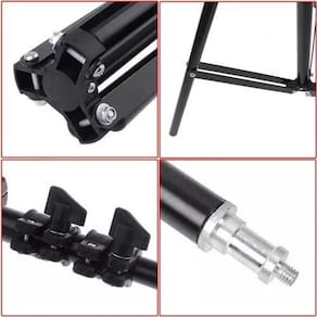 Este tripé é muito recomendado para uso com equipamentos fotográficos e de iluminação, pois possui uma estrutura resistente com armação composta por materiais de alumínio e partes plásticas. Pode alcançar uma altura máxima de 2,10 metros e mínima de 56cm quando totalmente fechado, pesando apenas cerca de 650 gramas.