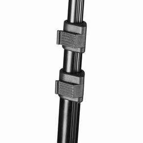 Este tripé possui 3 seções independentes, o que permite ajustar a altura conforme a necessidade do usuário. Suas seções são travadas com tensionadores especiais, fabricados com materiais de qualidade e resistentes, garantindo a segurança e estabilidade do equipamento durante o uso.