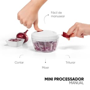 - Pica ou Tritura diversos tipos de alimentos: - Fácil de limpar, e ocupa pouco espaço na cozinha: - Acionamento giratório através de corda retrátil: - Não deixa pedaços grandes apos processamento: - Formato anatômico e pratico: - Fácil manuseio