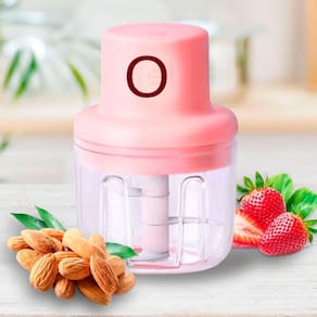 Triturador de Alimentos Portátil Mini Ideal para Cozinhas Pequenas Operação simples: Basta pressionar o botão e em segundos o alho, pimenta ou outro alimento é triturado. Este modelo tem três lâminas de aço inoxidável.
