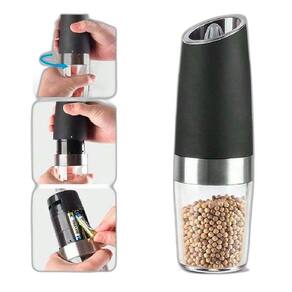 Triturador elétrico portátil com corpo em ABS, engrenagem do moedor em cerâmica e ajuste de moagem. Possui sensor de gravidade para acionamento automático ao virar para baixo. Ideal para moer pimenta do reino, sal, café e outros temperos em grãos.Desmontável