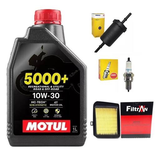 01L - ÓLEO MOTUL 5000+ 10W30 1L MOTUL 01 - FILTRO COMBUSTIVEL BICO FINO KL741 METAL LEVE 01 - VELA CPR8EA-9 NGK 01 - FILTRO AR FILTRAN