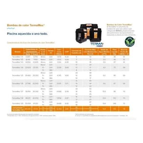 • TermaMax® 3 é monofásico, com tensão 220 V, conta com ventilador de baixo nível de ruídos, sistema de degelo a ar de série, é de fácil instalação e operação. Seu painel digital tem sinalização de falhas protegendo o equipamento de danos. Pode ser instalado em conjunto com qualquer tipo de tratamento químico da água (gerador de cloro, ozonizador etc.), sem acarretar na perda da garantia.