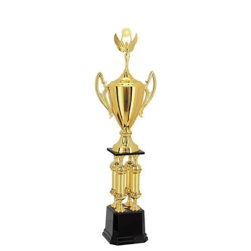 200801-DO -Troféu com altura de 104 cm com base octogonal de 17,5 cm de largura em polímero na cor preta. Sobre esta base quatro suportes fabricados em polímero metalizados na cor dourada e sobre estes suportes quatro componentes de polímeros em formato de bola metalizados na cor dourada. Sobre estes quatro componentes quatro colunas com detalhes em alto relevo metalizadas na cor dourada, fabricadas em polímero. Sobre estas colunas mais quatro componentes em formato de bola metalizados na cor dourada e sobre estes quatro suportes fabricados em polímeros metalizados na cor dourada. Sobre eles uma base quadrada em MDF na cor preta. Sobre esta base um suporte em polímero metalizado na cor dourada e uma bola em polímero metalizada na cor dourada. Sobre esta bola uma taça em polímero metalizada na cor dourada com tampa em polímero metalizada na cor dourada com 27 cm de largura a partir das alças. Sobre a taça uma estatueta intercambiável. Este troféu pode ser feito com os componentes metalizados pintados totalmente na cor prata.