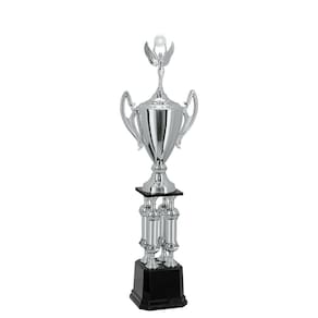 200803-DO -Troféu com altura de 92 cm com base octogonal de 17,80 cm de largura em polímero na cor preta. Sobre esta base quatro suportes fabricados em polímero metalizados na cor dourada e sobre estes suportes quatro componentes de polímeros em formato de bola metalizados na cor dourada. Sobre estes quatro componentes quatro colunas com detalhes em alto relevo metalizadas na cor dourada, fabricadas em polímero. Sobre estas colunas mais quatro componentes em formato de bola metalizados na cor dourada e sobre estes quatro suportes fabricados em polímeros metalizados na cor dourada. Sobre eles uma base quadrada em MDF na cor preta. Sobre esta base um suporte em polímero metalizado na cor dourada e uma bola em polímero metalizada na cor dourada. Sobre esta bola uma taça em polímero metalizada na cor dourada com tampa em polímero metalizada na cor dourada com 27 cm de largura a partir das alças. Sobre a taça uma estatueta intercambiável. Este troféu pode ser feito com os componentes metalizados pintados totalmente na cor prata.