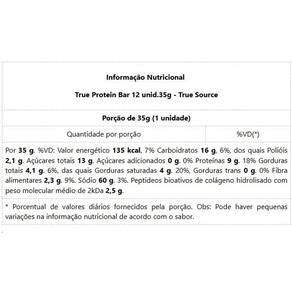 True Protein Bar (12 unid. 35g) A True Bar Protein da True Source é perfeita para quem busca aliar saúde e sabor. Com um sabor inesquecível, ela é formulada com 2,5g de colágeno Verisol na porção diária, contribuindo para a beleza da pele e a saúde das articulações. Além disso, não possui açúcares adicionados nem corantes artificiais, garantindo uma escolha mais natural e saudável. Inclua aA barra de proteína True Protein Bar Display da marca True Source é a escolha ideal para quem busca um lanche nutritivo e saboroso. Com um delicioso sabor de caramelo, cada barra de 35g oferece 130 kcal, tornando-se uma opção prática para complementar sua dieta.